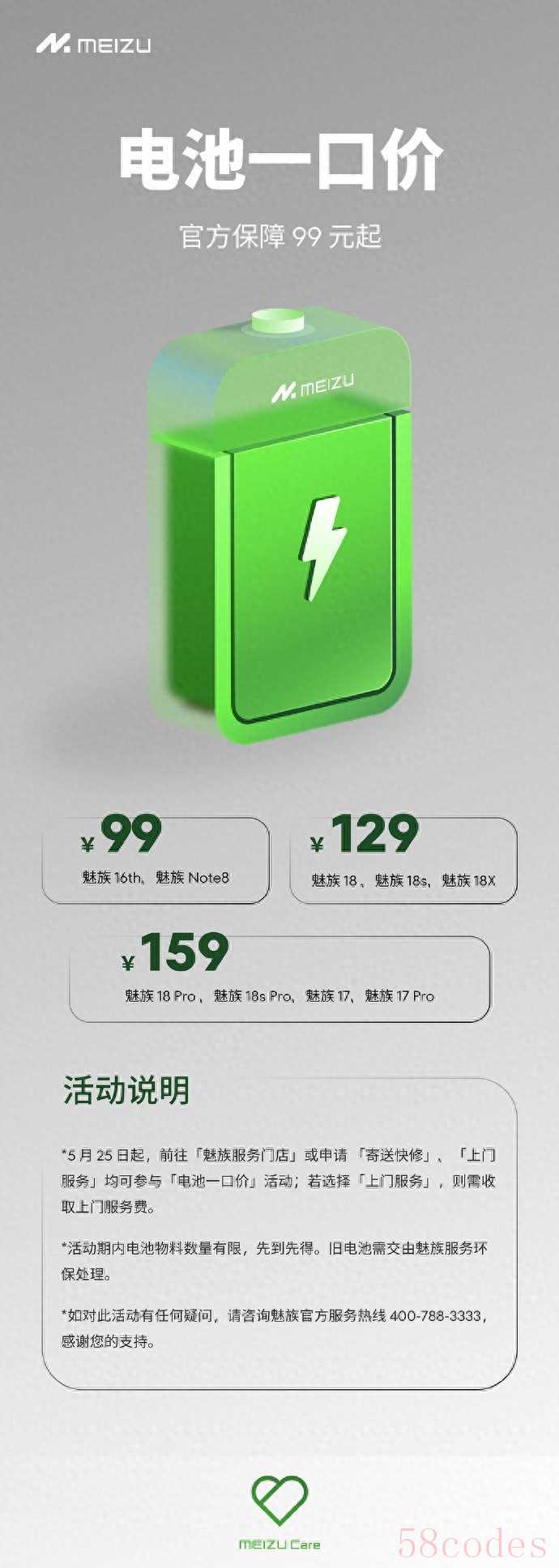 IT之家 5 月 26 日消息,魅族为魅族 16th、魅族 Note8、魅族 18、魅族 18s、魅族 18X、魅族 18 Pro、魅族 18s Pro、魅族 17、魅族 17 Pro 推出“电池一口价”服务,5 月 25 日起前往“魅族服务门店”或申请“寄送快修”、“上门服务”均可参与活动。