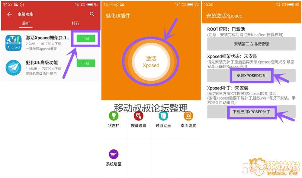 3、如下图所示,直接点击下载“激活Xposed魅化UI插件”,下载完毕直接安装后打开,点击大按钮“激活XPOSED”,先点击“安装XPOSED应用”,安装完毕后,点击“下载应用XPOSED补丁”,期间会有ROOT权限询问,必须选择“允许”!最后手机会自动重启,耐心等待几分钟,即可安装并激活成功XPOSED框架。