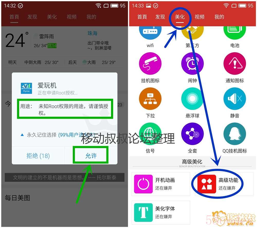 2、打开Kingroot软件,将爱玩机的权限设置为“允许”。打开“爱玩机”,点击顶部的“美化”,然后点击最下方的“高级功能”