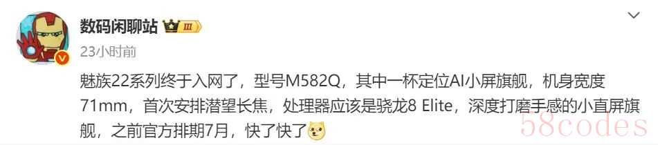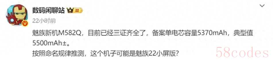 昨日,博主@数码闲聊站 发文爆料,“魅族新机M582Q,目前已经三证齐全了,备案单电芯容量5370mAh,典型值5500mAh±。按照命名规律推测,这个机子可能是魅族22小屏版?”