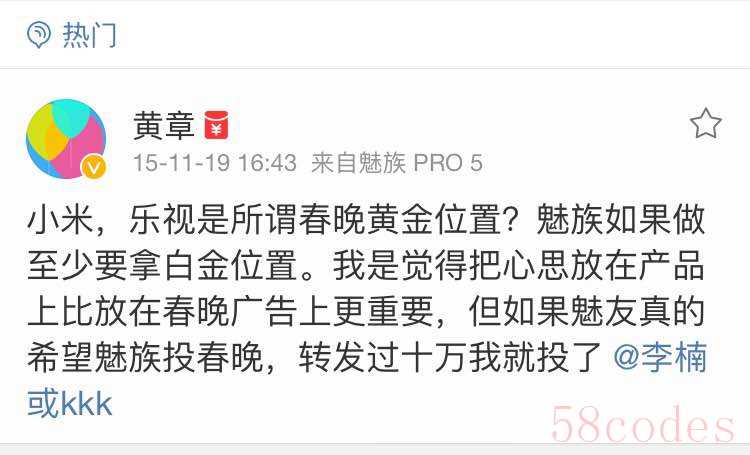 而在这些互联网品牌之中最受关注的应当魅族莫属,这是因为魅族刚开始并无投春晚广告,而是后来魅族创始人黄章在微博放豪言微博过十万就投广告,魅友们当然是热情满满,轻松助力破十万,魅族投春晚如此而来。