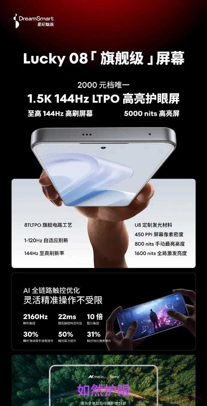 如果说外观设计只是魅族Lucky08的“敲门砖”,那么它搭载的1.5K144HzLTPO高亮护眼屏,则足以称得上是2000元档手机中的“王炸”