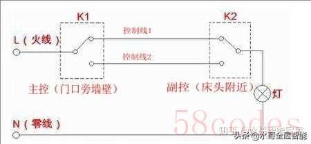 通过“信号线”原理实现两个开关都能控制灯的开、关,如果要双控还比较简单,如果要多控的话,一是需要大量布线开槽,二是会越来越复杂,一般来说最多就是三控,再多的话墙壁开槽、线路、人工成本高到吓死你