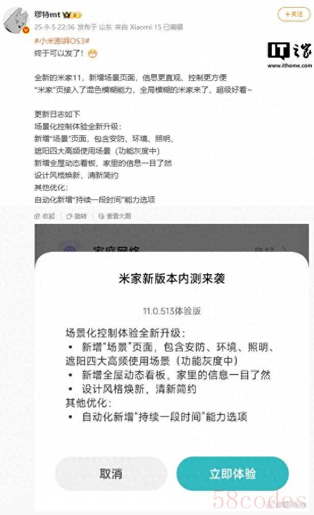 IT之家 9 月 7 日消息,据博主 @缪特mt 透露,小米米家 App 开启 11.0.513 体验版内测,部分用户可提前享用新功能,场景化控制体验全新升级。