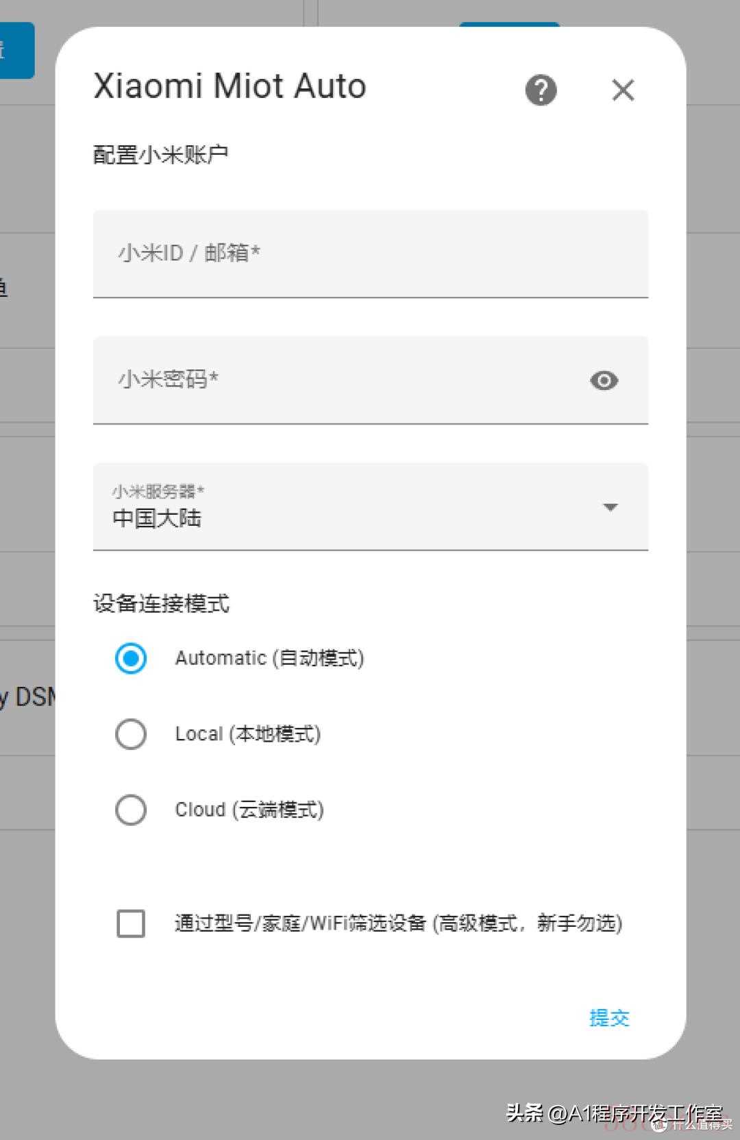 在点击添加Xiaomi Miot插件后,系统会提示我们进行配置。这时,需要输入我们的小米账户信息。输入小米账号信息后,Home Assistant才能访问并控制米家生态中的设备。根据提示,输入你的账号和密码,然后点击“下一步”按钮。配置过程一般只需要几步,大部分情况下只需一直点击“下一步”或“提交”即可。最终,当配置完成后,Home Assistant会提示成功添加Xiaomi Miot插件。