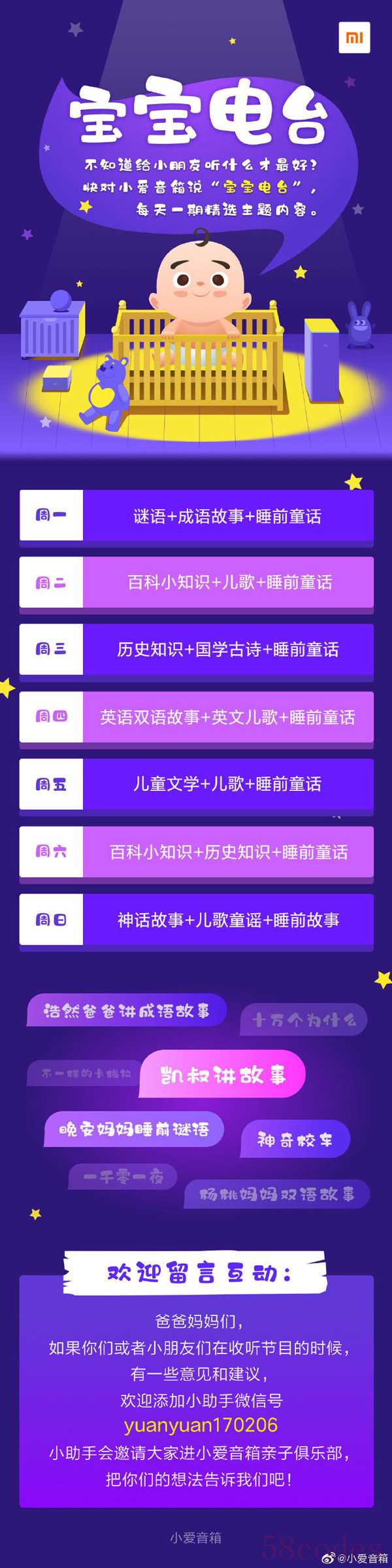 小爱音箱宝宝电台节目单:周一,谜语+成语故事+睡前童话;周二,百科小知识+儿歌+睡前童话;周三,历史知识+国学古诗+睡前童话;周四,英语双语故事+英文儿歌+睡前童话;周五,儿童文学+儿歌+睡前童话;周六,科小知识+历史知识+睡前童话,周日,神话故事+儿歌童谣+睡前故事。