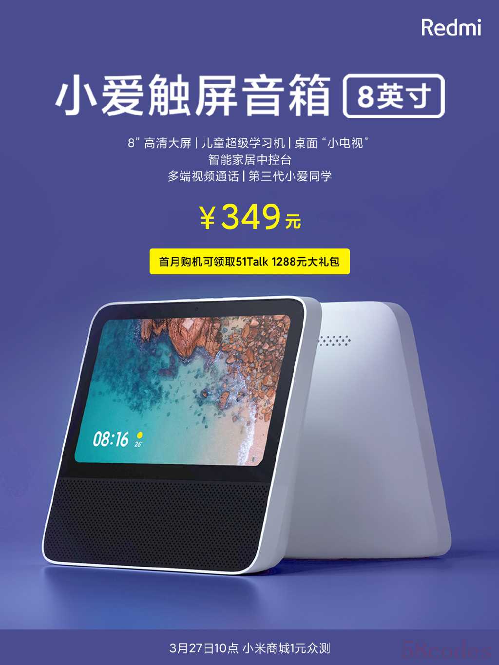 【环球网科技综合报道】3月24日,在Redmi K30 Pro发布会期间,Redmi红米手机发布Redmi小爱触屏音箱8英寸版,定价349元,将8英寸带屏AI音箱带入300元时代。这款新品已经开启预约,将于3月27日10点开卖,首月购买的用户还可以领取51Talk 1288元大礼包。