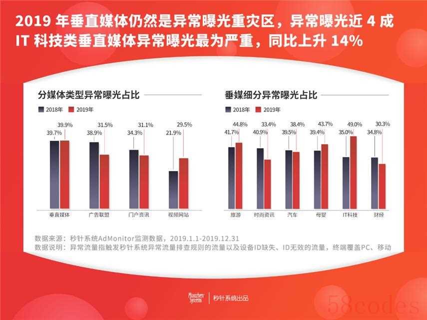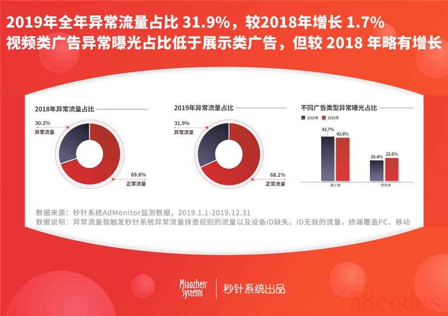 这份数据来自全域测量及商业智能分析解决方案提供商秒针系统最新发布的《2019年度中国异常流量报告》,该《报告》基于客观、准确的监测数据,全面揭示了中国数字营销行业欺诈现状。除了以往的PC、移动互联网品牌广告,报告还首次对NEW TV、线下户外、网站留资、社交平台及KOL等终端及媒体形式的异常情况进行了分析。