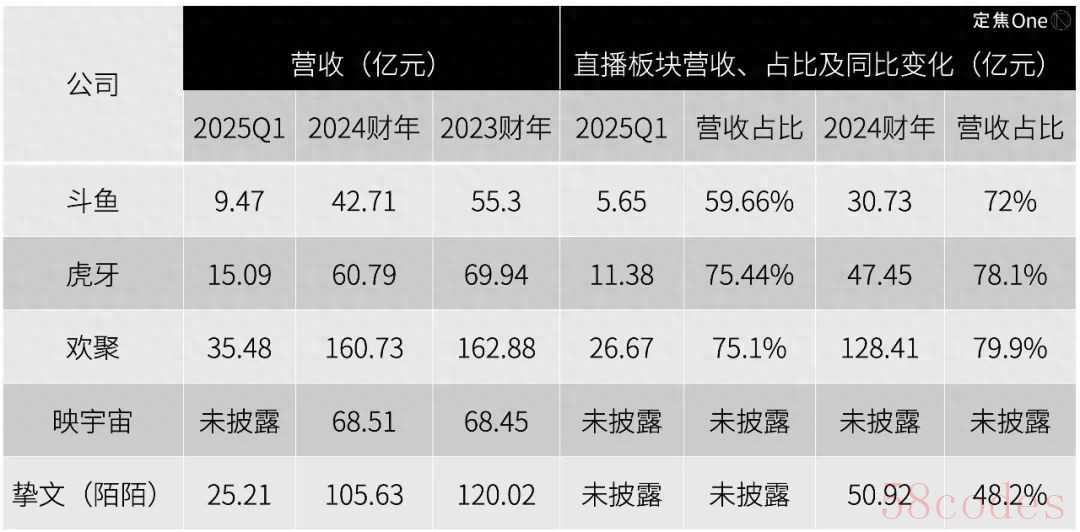 2025年Q1,也延续了这一趋势,斗鱼、虎牙、欢聚的直播营收占比分别为约60%、75%、75%,而挚文从2025年Q1起将直播服务与增值服务合并为“增值服务”,不再单独披露。