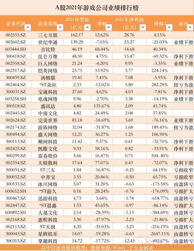 1. "三七互娱 (300759.SZ)":2021年全年实现营业收入 "209.72亿元",归属于上市公司股东的净利润为 "18.86亿元"。凭借《传奇手游》、《和平精英》等爆款产品,三七互娱在2021年表现强劲。