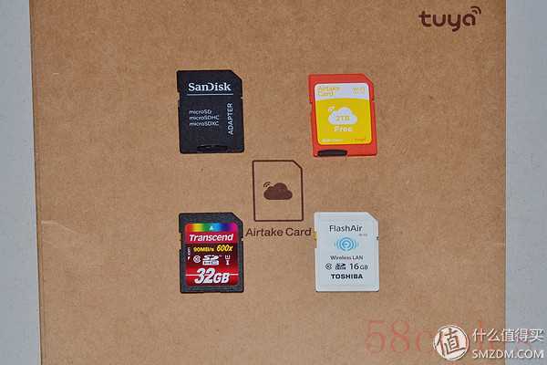 大乱斗四虎将:闪迪SD卡套、爱相机WiFi卡套、创见 32GB UHS-I 600X SD存储卡、东芝 16G FlashAir 第二代无线局域网嵌入式SDHC存储卡(Class10)。(顺序从左到右,从上到下。)卡套内都使用赠送的金士顿 32G microSD卡。