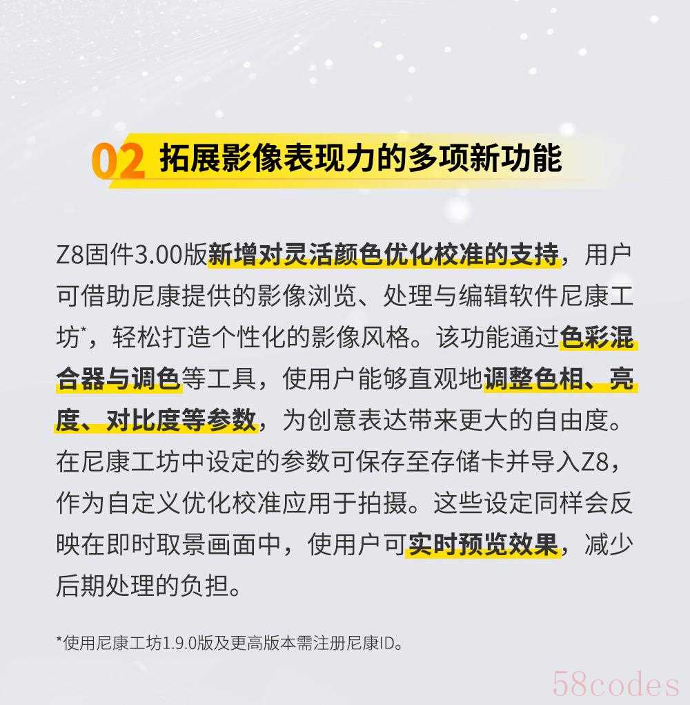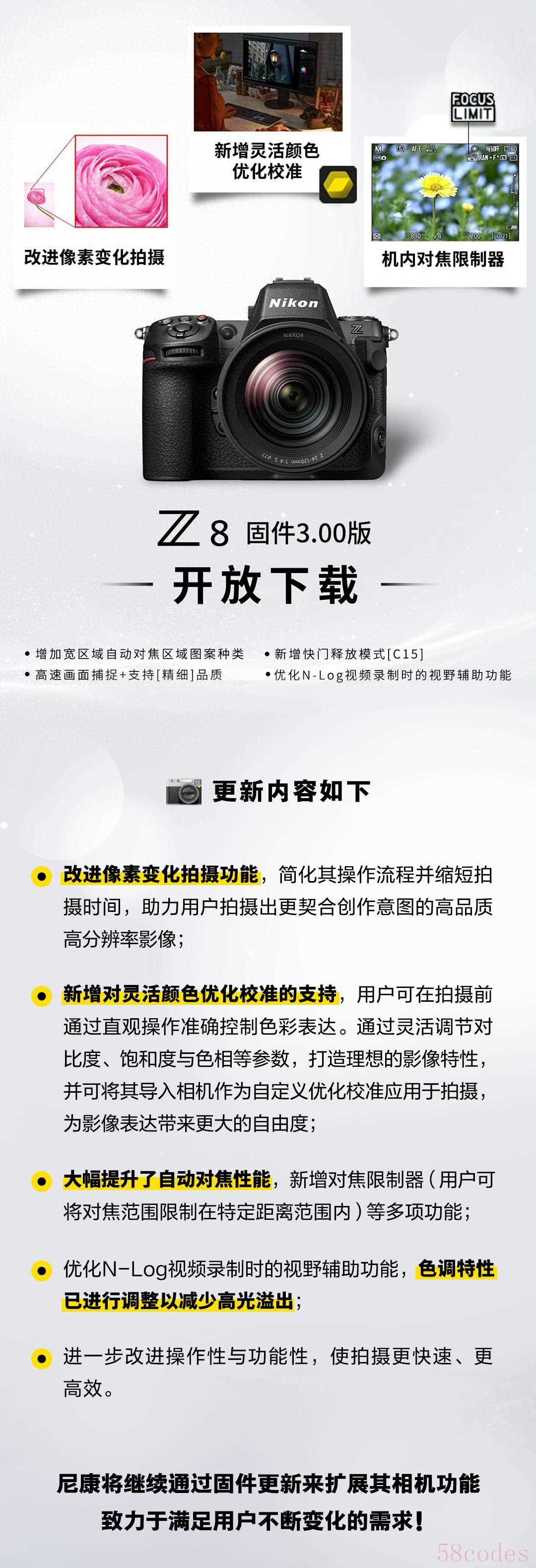 此外,尼康Z8固件3.00版本还带来了一些其他改进和功能更新,如: