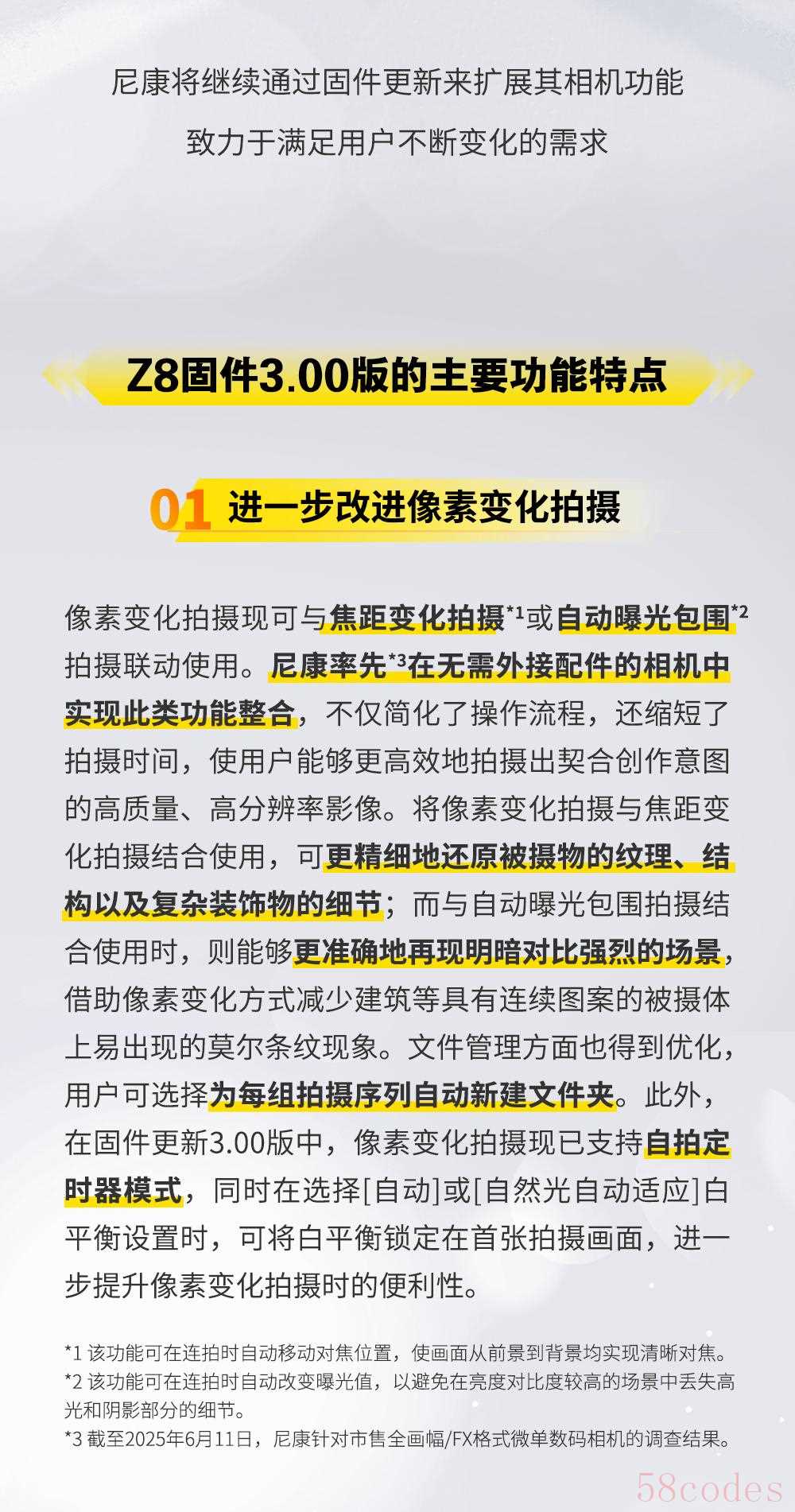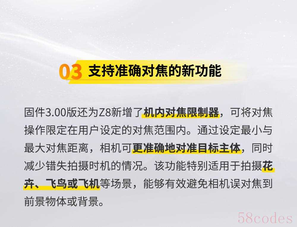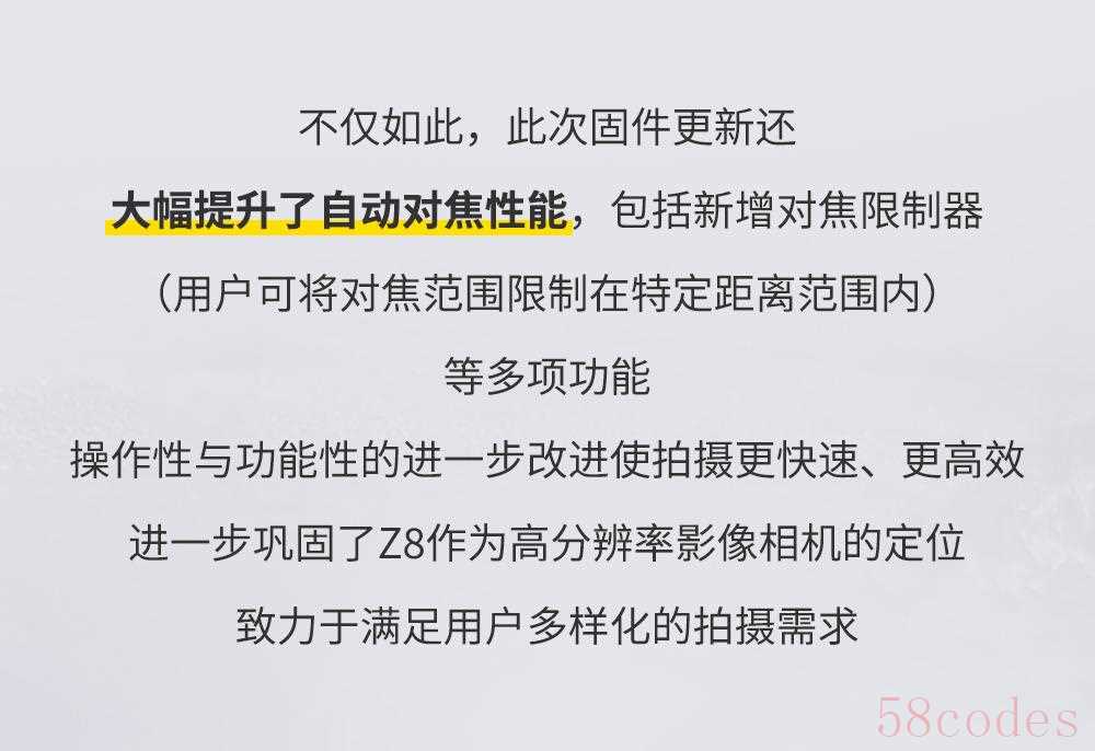 4. 自动对焦稳定性增强:新固件还增强了Z8在自动对焦方面的稳定性,减少了因相机抖动或光线变化导致的对焦失败。这一改进有助于用户在各种拍摄环境下都能获得清晰、稳定的画面。
