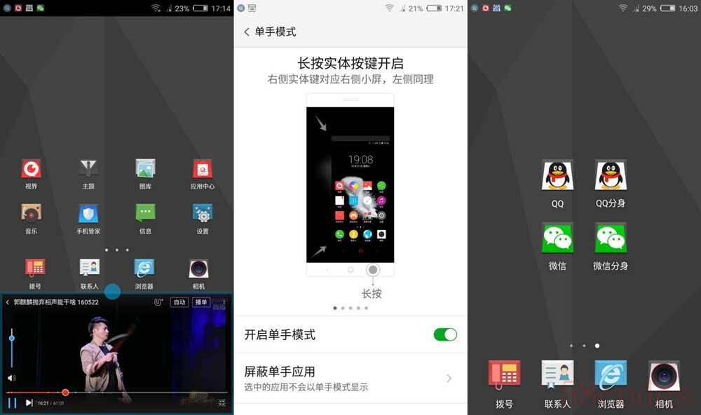 因为只是5英寸小屏,分屏模式对于观影来说意义不大。但是分屏比例可调整,甚至让其中一个窗口占据全屏,达到双线程并行随时呼出的效果。应用分身暂时只支持微信和QQ,单手模式也很少用到。
