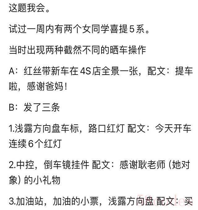 "方式三:体验感受式。" 发一张车内环境、方向盘、或者某个让你觉得满意的设计细节的照片。配文:“新座驾的细节,还挺惊喜的。/ 感受一下新科技的便利。”