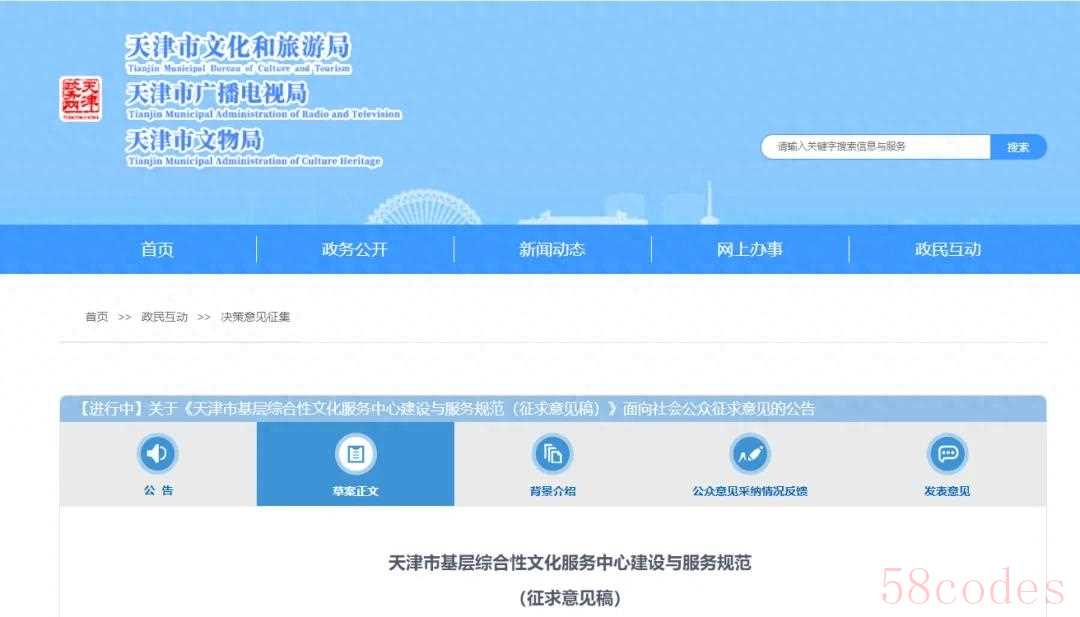 日前,天津市文化和旅游局发布“关于《天津市基层综合性文化服务中心建设与服务规范(征求意见稿)》面向社会公众征求意见的公告”,其中提出:每个乡镇(街道)应设置综合性文化服务中心。每个村(社区)应设置综合性文化服务中心。基层综合性文化服务中心全年(含节假日)向公众免费开放。
