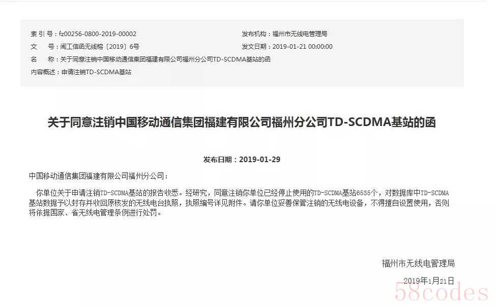 早在2019年1月,福州市无线电管理局给福州移动发函称,同意注销6535个TD-SCDMA基站。这意味着福州移动当时正式完成了3G退网,同时TD-SCDMA清退工作也被公开化。中国移动清退3G网络的行动也不止于福州,而是在全国范围内全面铺开。