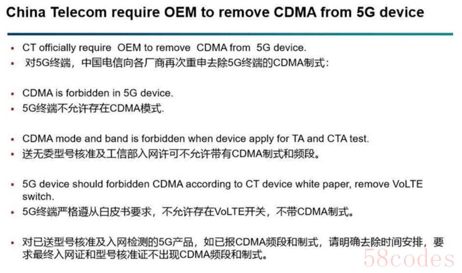 2019年雷科技曾经报道过,红米K30 5G因为不支持CDMA制式被部分网友吐槽。实际上,这种指责其实是冤枉小米了,不支持CDMA是电信要求的。中国电信的终端入网要求中写道,“5G终端不允许存在CDMA模式”。 电信还要求手机不能支持VoLTE开关,这应该是为了防止用户关闭后,打电话需要降级到CDMA网络。当然,电信敢这么要求,也是因为基本实现了VoLTE的部署。