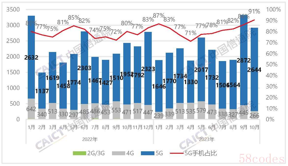 根据中国信通院数据,2023年1-10月,国内市场5G手机累计出货1.88亿部,在总出货量中的占比为81.9%。