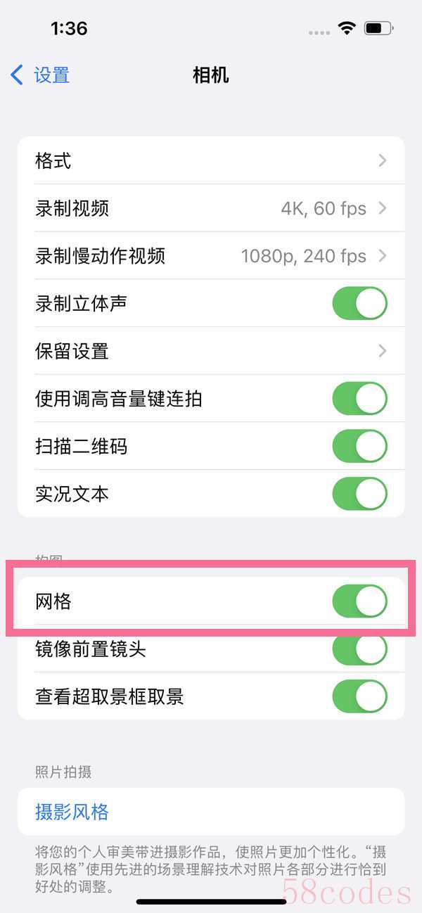 4. 打开"“网格”"开关,它就会在相机取景器中显示九宫格。