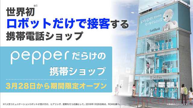由于Pepper是一款采用云端AI(人工智能)的机器人,所以想要让多台Pepper同步掌握一些新知识也不算难事。为了推广这台机器人,SoftBank将在3月28日至4月3日期间限定开设的“完全由Pepper提供服务的手机店”中,让熟知手机信息的Pepper帮助人类店员向顾客提供服务。Pepper在店内可以听取顾客的需求,为顾客介绍手机产品,在店内为顾客引路,直到最终顾客购入SoftBank旗下的智能手机。如果是新用户则需要与SaftBank签订入网合约,因此这一部分的业务可能需要人类店员的帮忙。