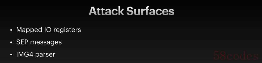 盘古团队还罗列出安全隔区处理器的三个攻击面,包括映射 IO 寄存器、SEP Messages、IMG4 解析器等。