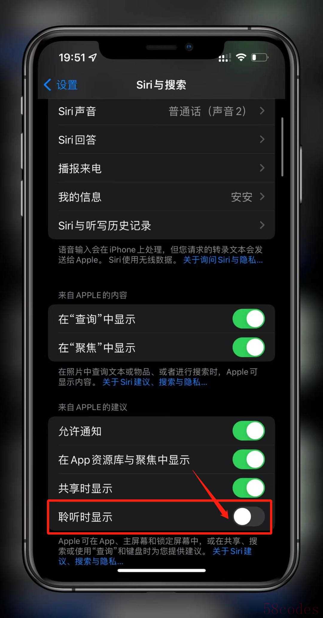 第️2步:下滑找到【聆听时显示】,把它关掉。
