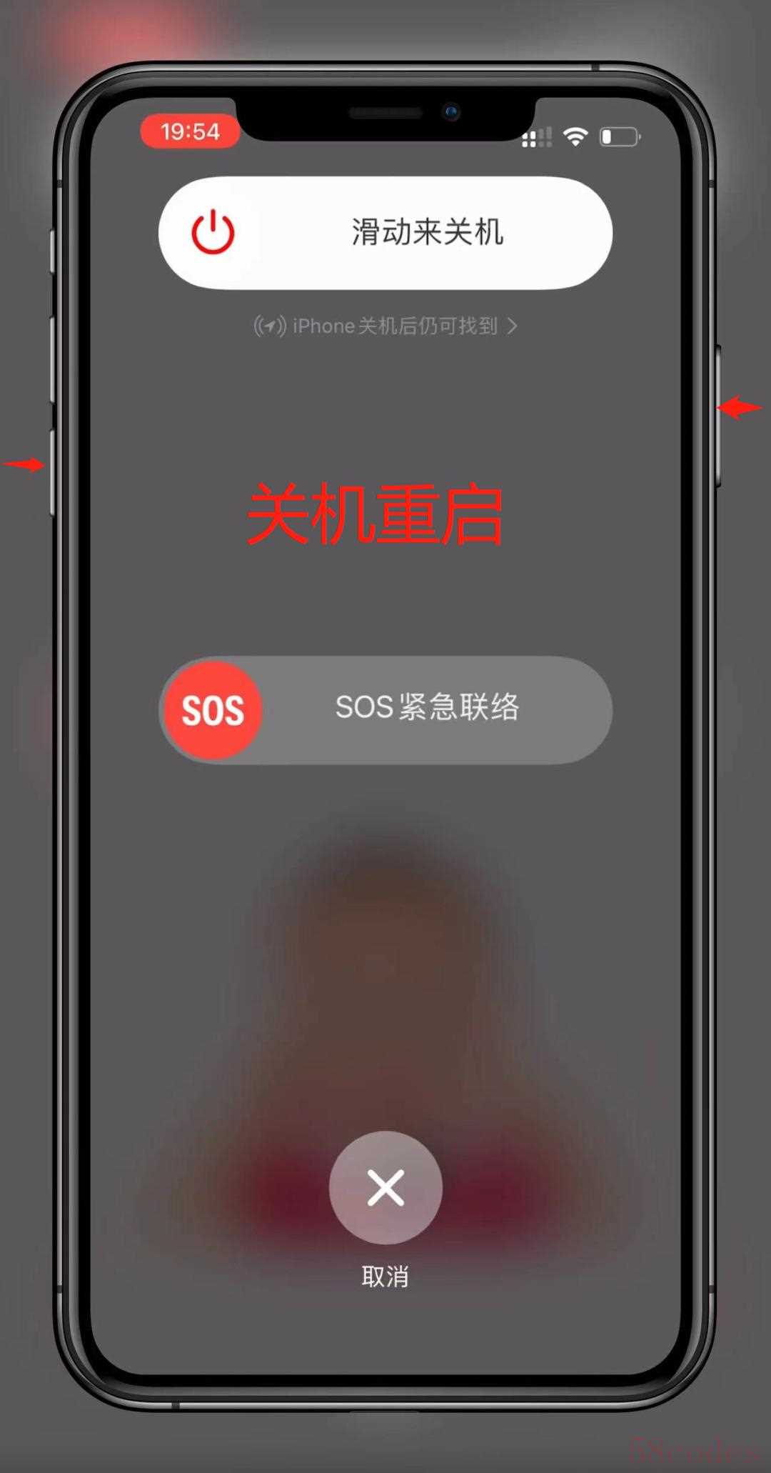第️3步:同时按住任一音量按钮和侧边按钮,直到出现关机滑块,关机后重启。