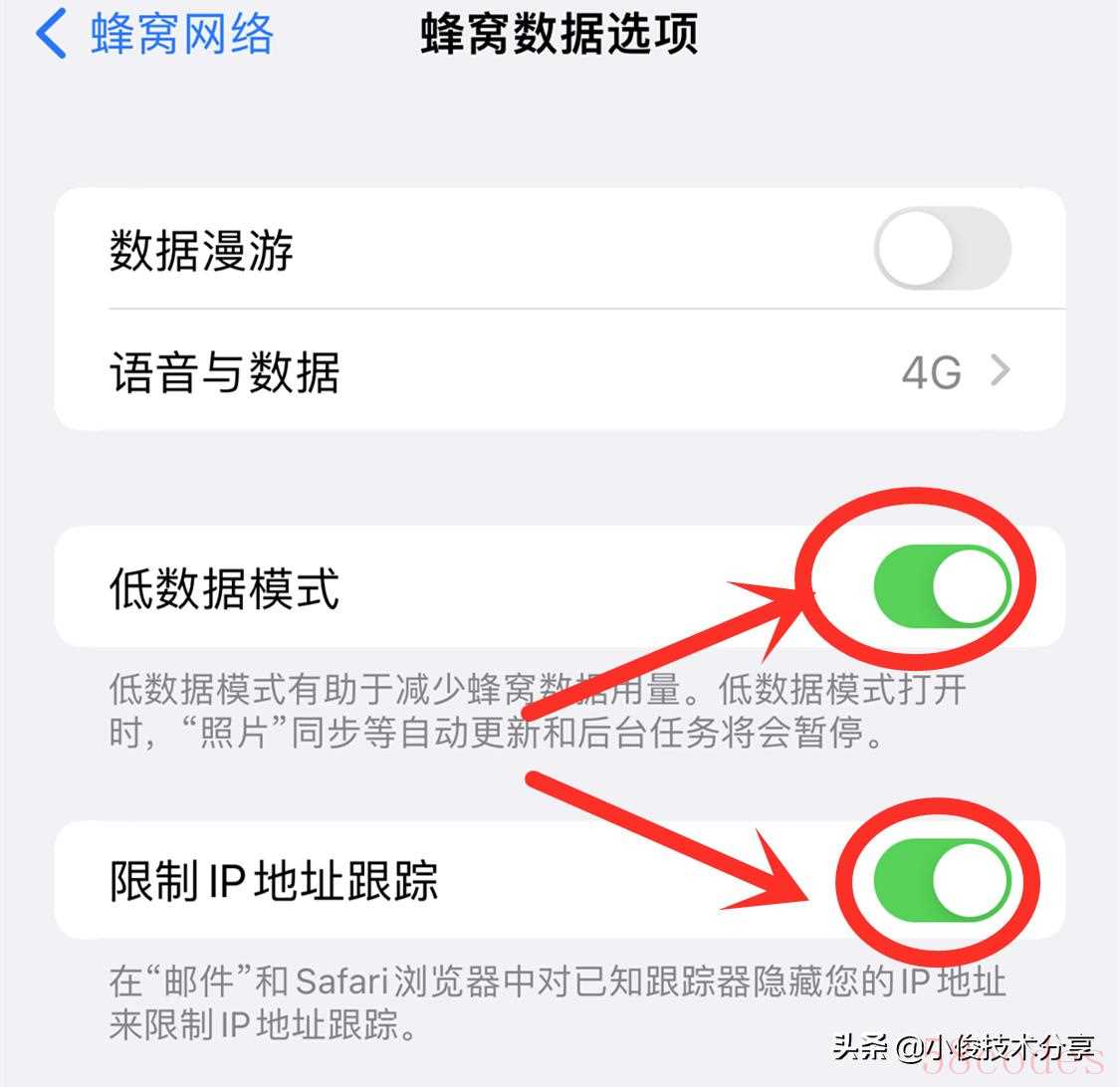 打开这2个开关之后,我们再次返回到【蜂窝数据】选项设置界面,此时我们把下面的【低数据模式】和【限制IP地址跟踪】这2个开关也打开!