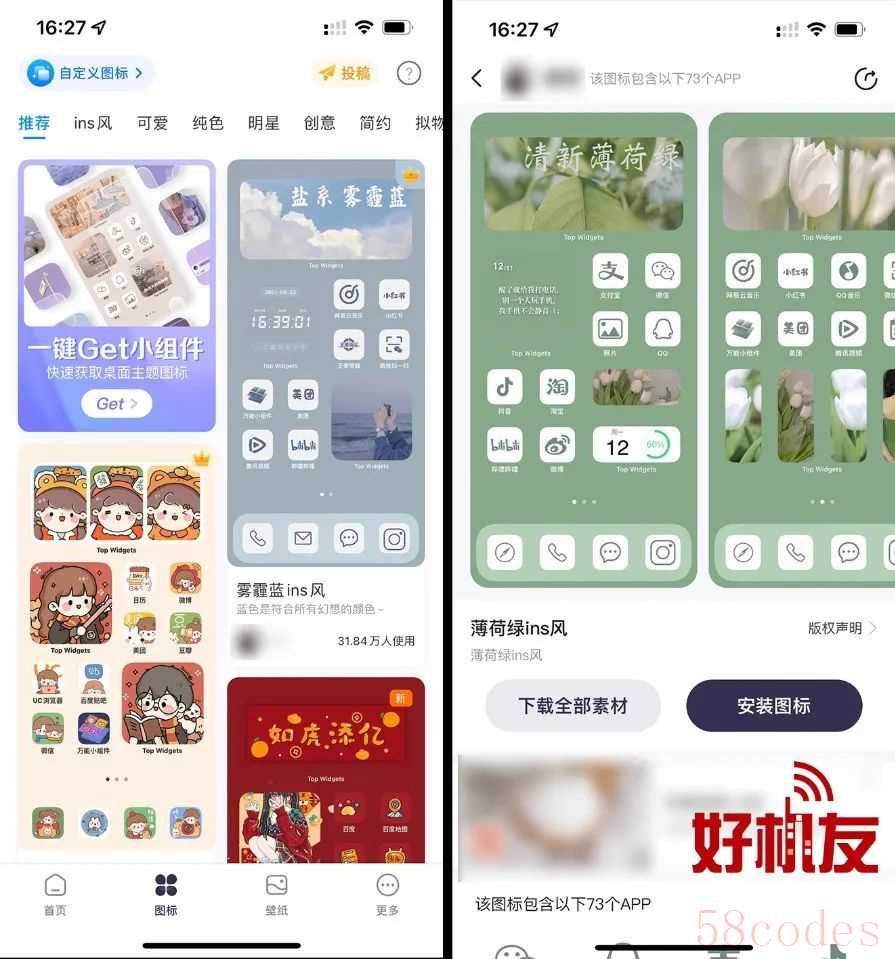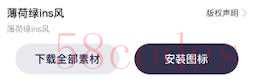 选中一个主题后,底下会有「下载全部素材」、「安装图标」两步操作。