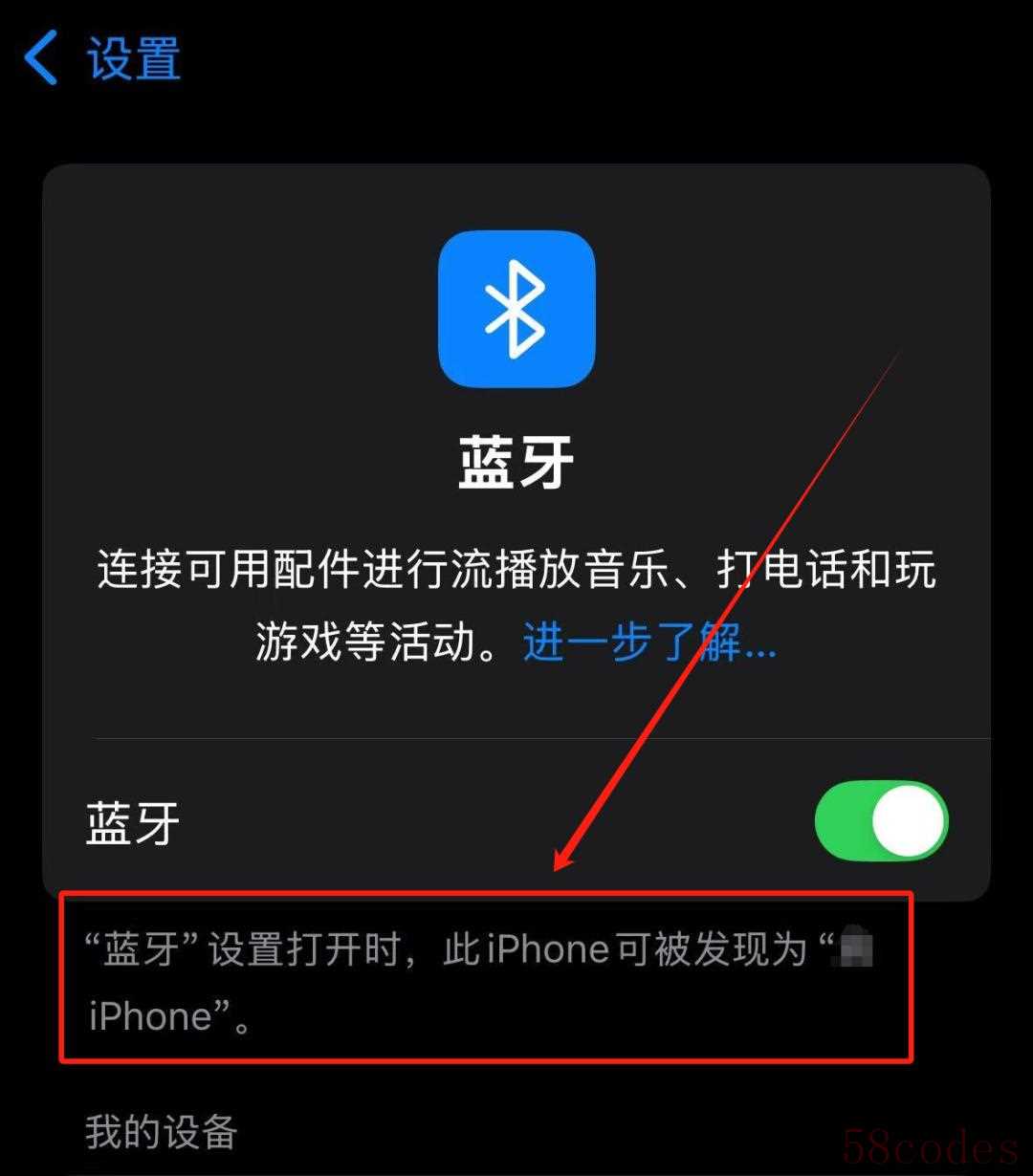 当我们的苹果手机蓝牙设置打开之后,就会显示我们的蓝牙名字。此名字与我们的本机名称是一致的,只需更改本机名称即可,具体为: