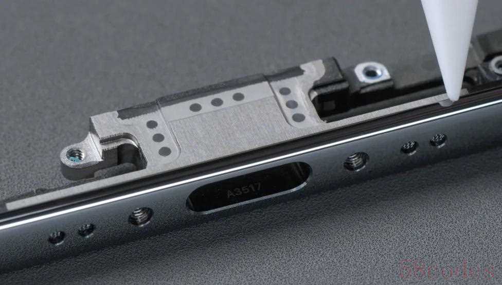 Air 的充电接口采用了USB-C 2.0,充电速度也由此降低至最高 20W 的有线充电速度。有意思的是,苹果采用 3D 钛合金打印,打造了接口的外壳增加耐用性。通过 Evident DSX 2000 显微镜拍摄图片后,iFixit 与专家讨论确认苹果采用了全新的 3D 打印过程,可能与苹果在 2015 的专利有关。