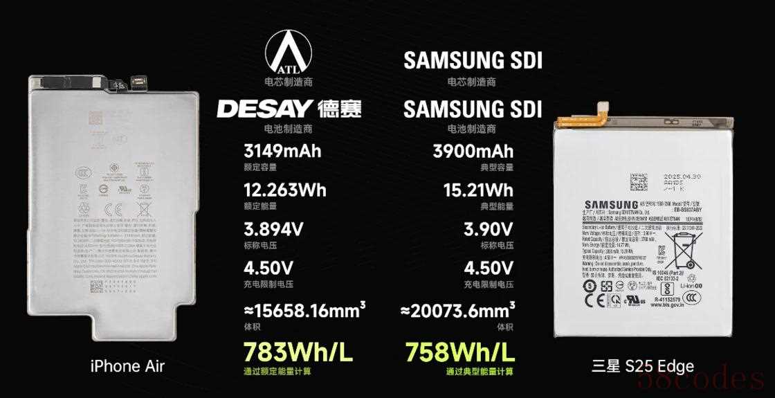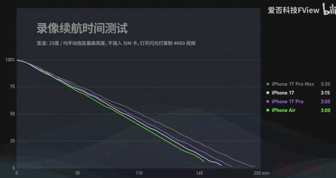 A19 Pro 芯片比标准版的能效更高,为了提升 Air 的续航,苹果还砍掉了A19 Pro 的一颗 GPU 核心。打开闪光灯录制 4K60 视频,Air 仅仅比 17 Pro 短了5分钟。The Tech Chap 的模拟测试下,续航 6 小时 43 分钟,比 17 标准版少了 10 分钟左右。