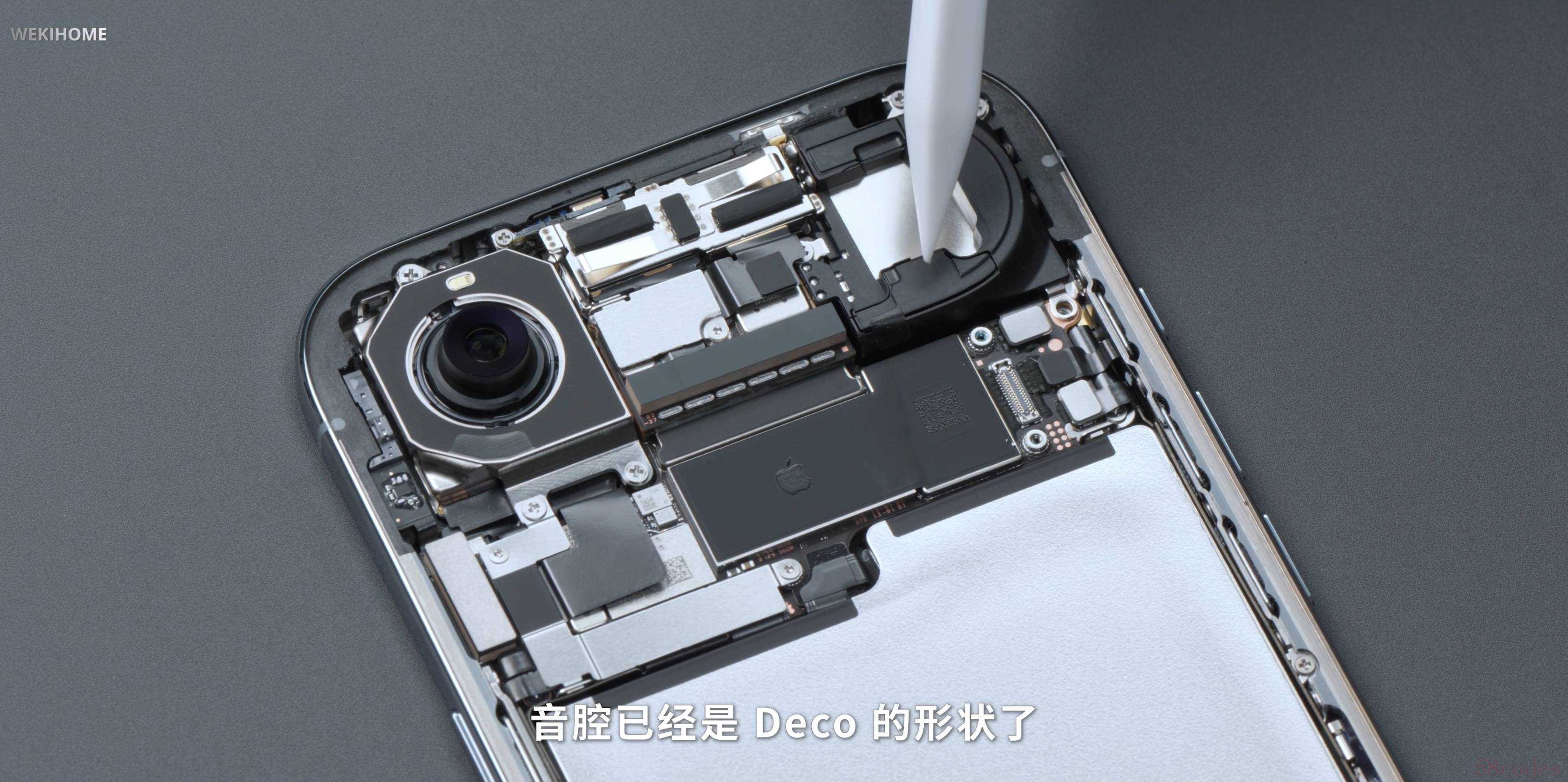 通过微机分的拆机视频我们可以看到,iPhone Air 顶部的「高原」内部足足三分之一的空间被让渡给了扬声器: