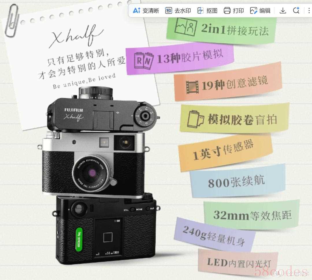 富士相机大都是理财产品或者玩具,其中X half可能在售机型中最便宜的玩具,它的机身小巧只有240克,也算是卡片相机。