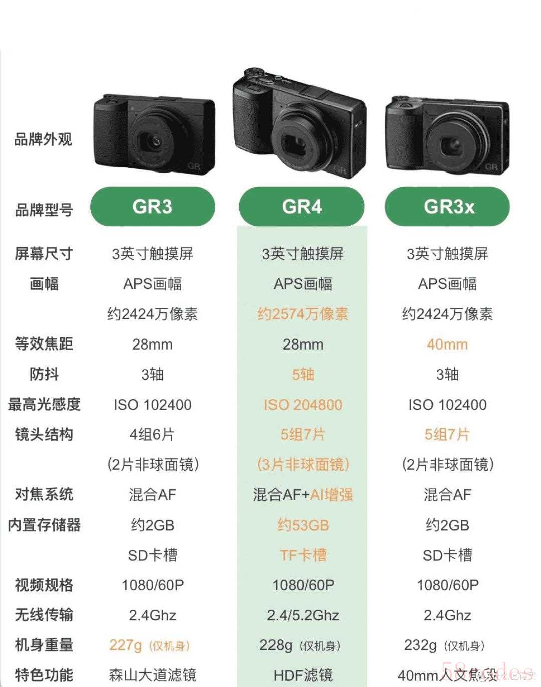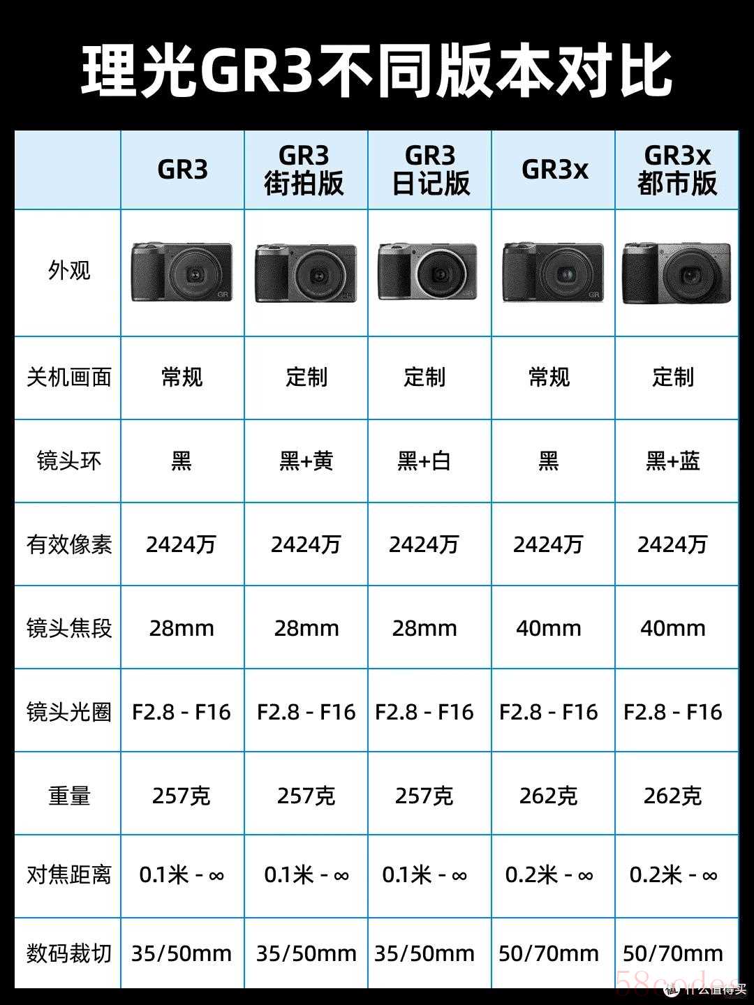 而理光GR3有标准版、GR3X、GR3 HDF、GR3X HDF,以及街拍版、日记版、都市版等不同配色主题的版本。各个版本的主要区别就看两点:第一,不带X的是28mm镜头,带差的是40mm镜头;第二,有无HDF后缀,就是有没有HDF滤镜效果的差异。