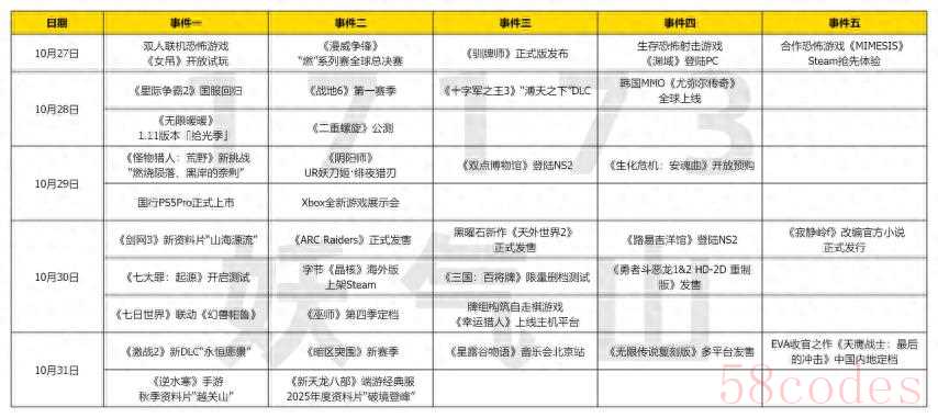 “无相楼”作为《剑网3》十六周年公布的“全民流派”概念的首次实践,打破了传统门派壁垒。所有满级角色,无论出身何门何派,皆可百分百学习并体验“无相楼”的全部武学内容。划重点:《逆水寒》手游秋季资料片10月31日上线10月31日,《逆水寒》手游秋季资料片“越关山”将正式上线,届时全新开放世界、全新剧情、全新摸金玩法等诸多内容都将一并更新。划重点:《无限暖暖》1.11版本「拾光季」将于10月28日正式开启《无限暖暖》1.11版本「拾光季」在近日公布了版本PV相遇即是奇迹,该版本将于10月28日正式上线,届时全新活动、新增搭配玩法等更多内容都将上线。划重点:《战地6》第一赛季10月28日上线 两张新地图试玩《战地6》第一赛季即将于10月28日上线,该赛季将会推出两张新地图,东方木林和布莱克韦尔油田。在时间方面,《战地6》第一赛季分成三个阶段陆续推出,分别是叛变行动(10.28上线),加利福尼亚抗战(11.18上线)和冬季攻势(12.9上线),并带来全新武器、装备、小工具、地图,以及为门户模式准备的每月更新内容。划重点:魔方《暗区突围》新赛季定档10月31日,赛季前活动“上暗稳赢节”开启魔方工作室开发的搜打撤手游《暗区突围》新赛季定档10月31日。届时,新角色「脉冲·马克西姆」将登场,同时新增「硬核模式」玩法。划重点:《怪物猎人:荒野》新挑战任务10月29日上线 狱焰蛸参战卡普空宣布,《怪物猎人:荒野》新挑战任务“燃烧陨落、黑岸的奈利”将于10月29日上线,历战王·狱焰蛸参战,迎接猎人们挑战。划重点:网易《七日世界》10月30日联动《幻兽帕鲁》网易旗下超自然生存游戏《七日世界》将于10月30日联动《幻兽帕鲁》,将为玩家带来一张专属联动岛屿地图,地图上将同时存在两款游戏中的生物。划重点:《阴阳师》UR妖刀姬·绯夜猎刃10月29日降临!《阴阳师》UR妖刀姬·绯夜猎刃10月29日上线。划重点:《城市:天际线2》将于10月30日推出“桥梁与港口”扩展包Paradox Interactive宣布,《城市:天际线2》的重大扩展包“桥梁与港口(Bridges&Ports)”将于2025年10月30日发布。该扩展包聚焦于管理、拓展和优化城市滨海区域,新增各种可升降桥梁和抽拉桥、可自定义港口、渡轮系统及全新的海事产业,同时提供大量新资产、新地图等内容。划重点:《十字军之王3》“溥天之下”DLC10月28日上线《十字军之王3》是一款由Paradox开发并发行的策略类游戏,故事背景定在了西方的中世纪。此前由于机制等原因,游戏中一直没有加入中国、日本等东方文明。“溥天之下”DLC正是为了弥补这个遗憾而诞生的,该DLC即将于10月28日上线。划重点:经典天龙2025年度资料片“破境登峰”经典天龙2025年度资料片“破境登峰”正式定档10月31日!划重点:激情国战MMO《赤壁之战》一折福利新服“班师回朝”10月28日上线国战网游《赤壁之战》一折福利新服“班师回朝”将在10月28日重磅开启!为了感谢所有玩家一直以来的支持与陪伴,在全新上线的新服中,官方会推出超值商品一折限时预购、预充限时获取极品魂器、老兵回归30倍返还等活动,感兴趣的玩家不要错过了。《赤壁之战》是一款以三国历史为背景的国战PK网游。剧情副本高度还原三国经典战役,随时可宣战攻打敌国都城。全日制PK玩法人气爆棚,PK掉落经验可拾取。【新游上线】划重点:《星际争霸2》国服10月28日回归《星际争霸2》国服官宣回归!10月28日,国服正式回归上线!本次星际2的国服回归基本意味着暴雪系游戏国服全面回归完成,网易和暴雪闹了一年的矛盾,现在也算是花了更多的时间弥补回来了。划重点:韩国大型MMORPG《尤弥尔传奇》10月28日全球上线韩国娱美德公司宣布,将于10月28日(周二)在全球170个国家推出旗下大型MMORPG《尤弥尔传奇》的全球版本。划重点:没有体力限制 没有抽卡的二游!《二重螺旋》10月28日公测英雄游戏旗下潘神工作室自主研发的免费ARPG《二重螺旋》将于10月28日正式上线。游戏支持PC(Epic Games商店)/iOS/Android多平台。且官方决定取消角色与武器抽卡系统,并废除体力限制。划重点:《ARC Raiders》10月30日正式上线,测试同时在线19万备受期待的搜打撤新游《Arc Raiders》将于10月30日正式发售,此前游戏在Steam上进行了一轮抢先测试,玩家人数也是相当之高。不过,近期有不少测试玩家表示游戏的运营有些让人不满,所以感兴趣的玩家最好还是先观望一下游戏评价在考虑入手。划重点:黑曜石娱乐旗下新作《天外世界2》将于10月30日正式发售由黑曜石开发、Xbox发行的科幻RPG《天外世界2》将于10月30日登陆PC、PS5和XSX|S平台,支持XGP,玩家将在一处新殖民地里结识新船员,找到新武器并遭遇新敌人,踏上紧张刺激的新冒险之旅。由于预购《天外世界2》高级版的玩家可以最多可提前5天抢先游玩,截至发稿前,《天外世界2》在Steam的评价为“特别好评”,好评率为90%。划重点:《路易吉洋馆》加入NSO扩展会员!10月30日上线任天堂官方宣布,经典游戏《路易吉洋馆》(Luigi’s Mansion)将于10月30日登陆Nintendo Switch 2,通过“Nintendo Classics”服务重返玩家视野。划重点:好评模拟名作《双点博物馆》10月29日登陆Switch 2世嘉宣布,经典“双点”系列名作之一的《双点博物馆》(数字版)将于10月29日登陆Switch 2,实体版稍后12月4日上市。划重点:《生化危机:安魂曲》将于10月29日开放预购,明年2月发售卡普空宣布,《