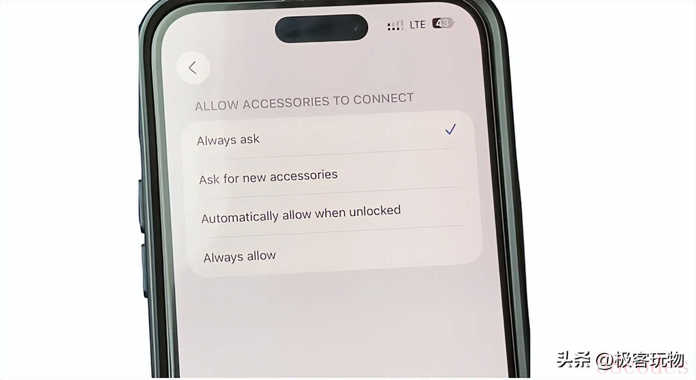 你可以选择"始终允许"、"解锁时允许"或"询问新配件"。这是防止通过USB连接进行数据盗窃的巧妙方式。