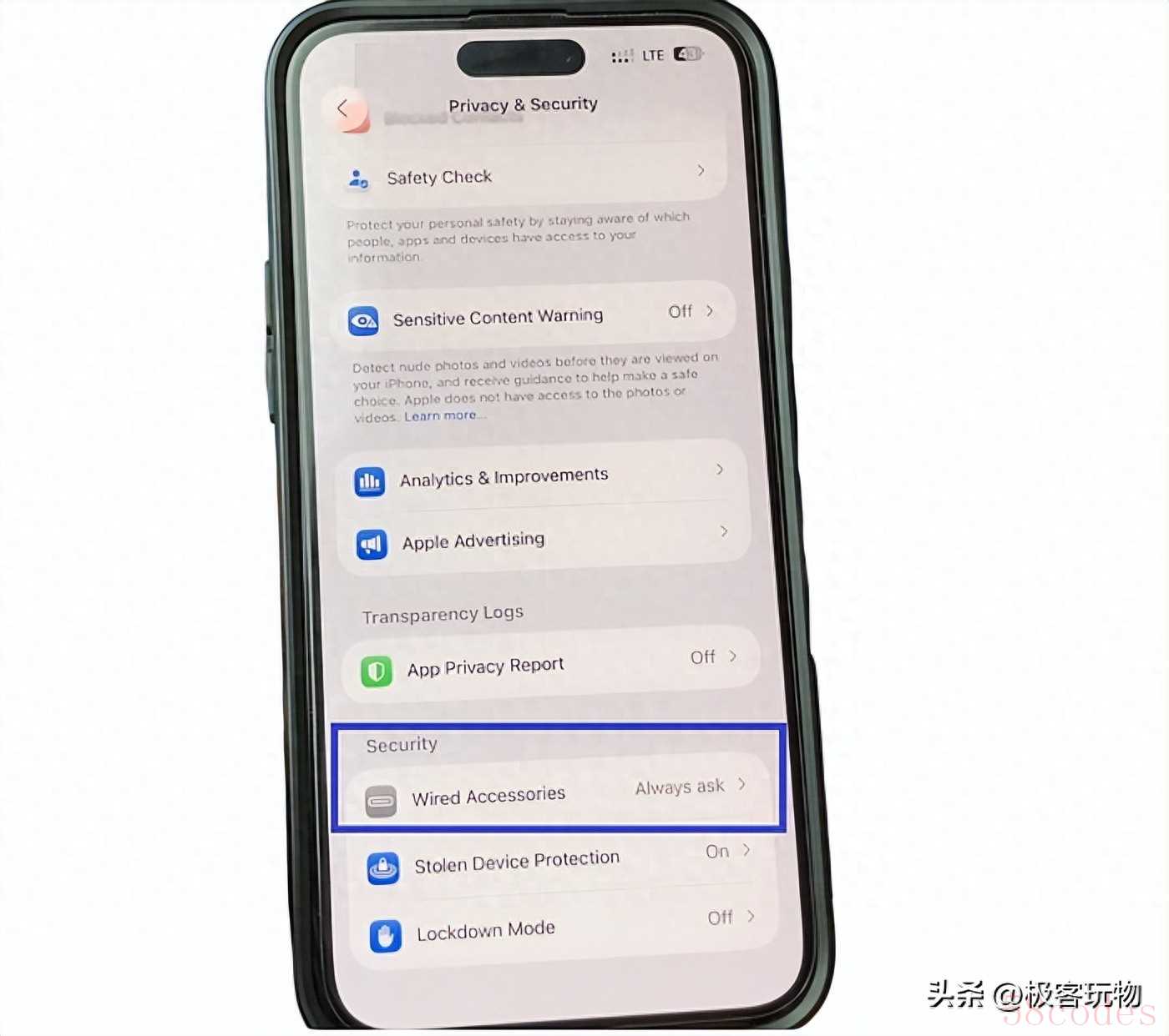 在"设置" > "隐私与安全"下,新增了一个菜单,让你决定iPhone如何处理USB配件。