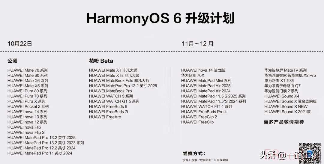 鸿蒙6已经面向90多款设备开放升级。如果你用的是以下设备,可以尽快体验: