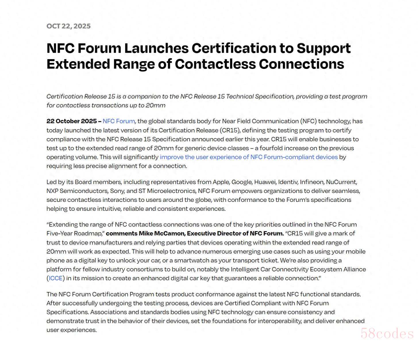 10 月 22 日,NFC 技术领域的全球标准认证机构——近场通信论坛(NFC Forum)正式推出 NFC 认证版本 15(Certification Release 15,CR15)。新的 NFC 技术认证版本,将使相关企业能够在通用设备类别中测试高达 20mm 的读取距离,相比之前规范的 5mm 范围实现数倍扩大。