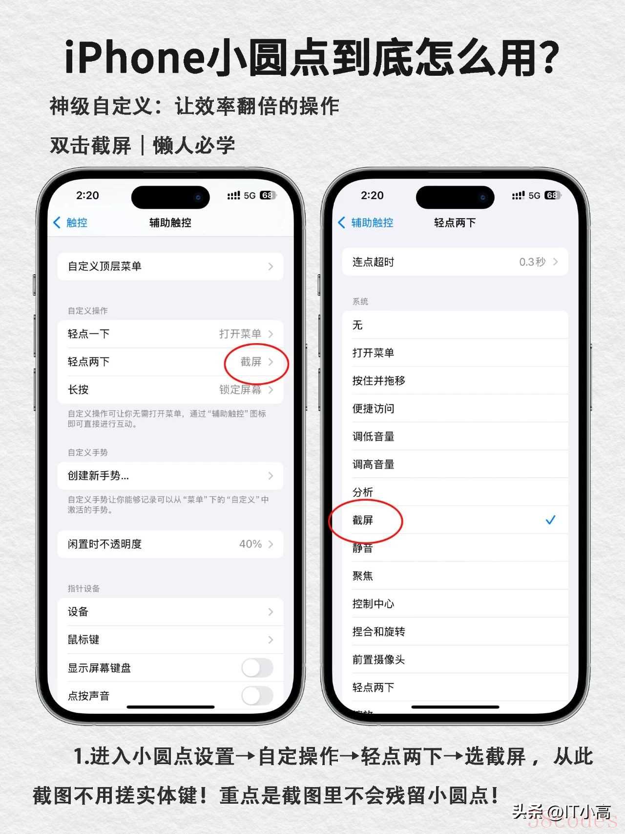 进入小圆点设置→自定操作→轻点两下→选截屏