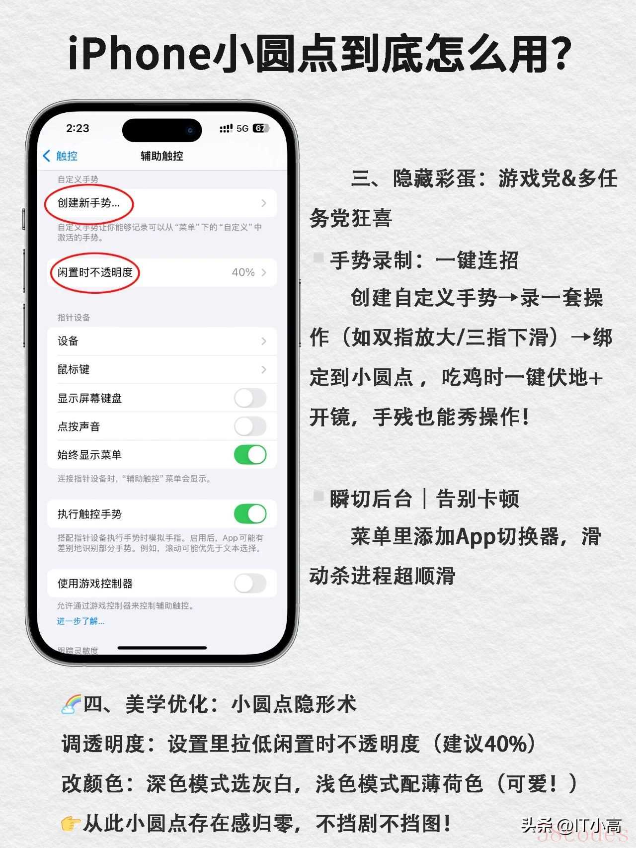 创建自定义手势→录一套操作(如双指放大/三指下滑)→绑定到小圆点