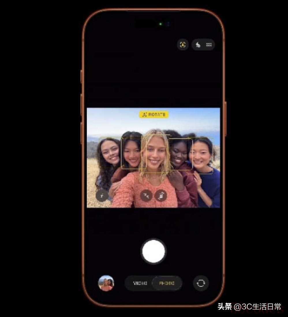 iPhone 17 全系列和 iPhone Air 配备了 1800 万像素的 Center Stage 前置相机,支持自动旋转和自动缩放。无论是自拍还是多人合影,系统会自动调整画面,确保每个人都能出现在镜头内。