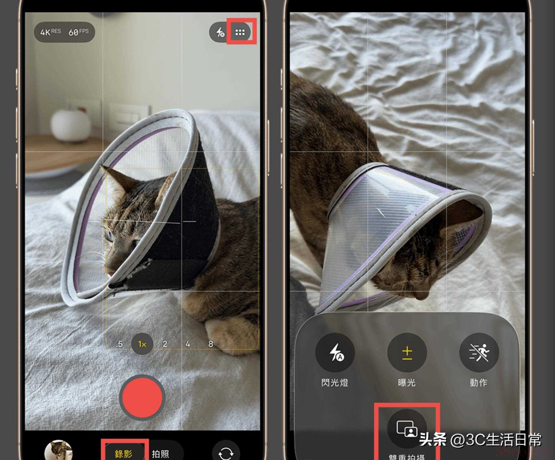 通过 iPhone 相机设置,你可以选择启用该模式,拍摄时,前后镜头的画面会显示在同一界面,带来全新的创作体验。