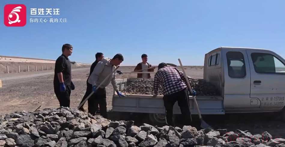 陆遥:我们在去之前拉了5包石头,倒在上面看行不行,然后用无人机升上去看是不是统一的。但是发现5种石头都不行,所以我们当时采取一个办法,就是干脆就用戈壁上的石头。我们挑来一些大的石头,放在我的小货车上面,用了一车,发现只能补那么一点点,就感觉像杯水车薪一样。