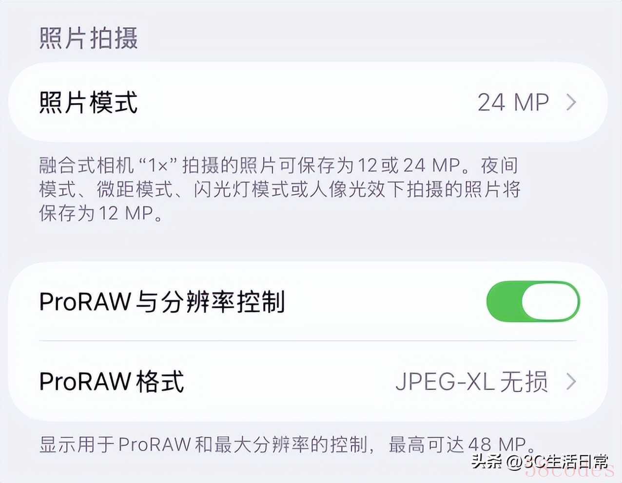 - 48MP:如果你追求极致细节,开启Pro 格式并设置为 48MP,能拍出更精细的画面。但记住,48MP的文件会占用更多空间。