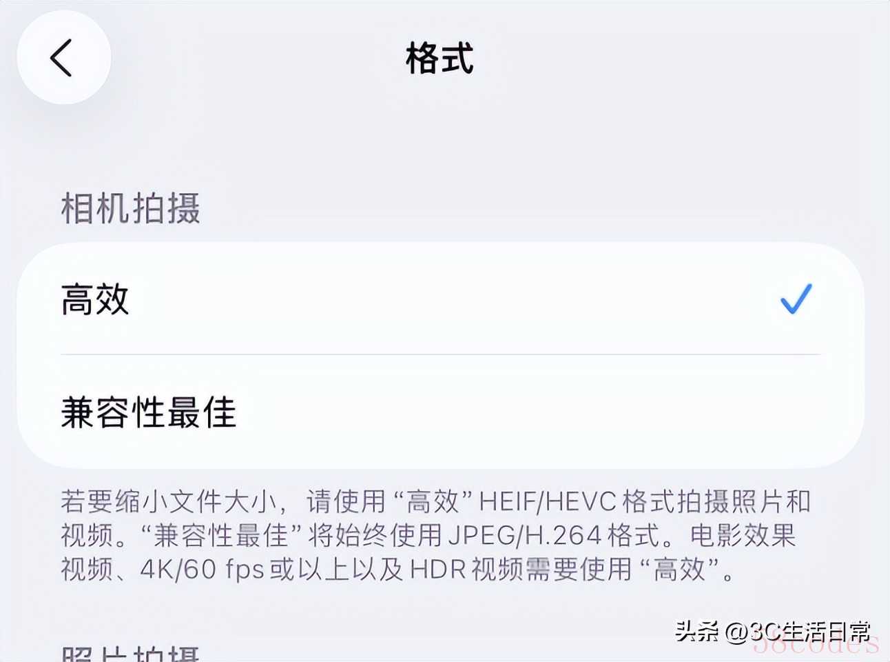 - 高效率(HEIF格式):压缩更高,节省空间,颜色和细节更丰富。