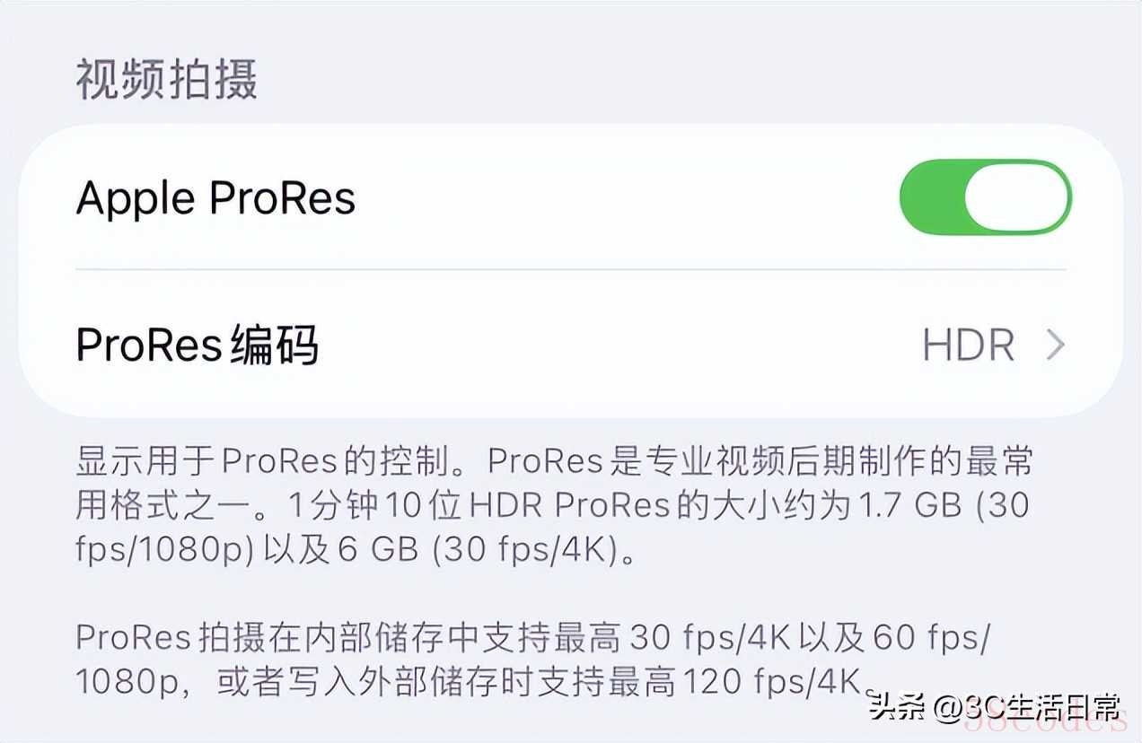 - 进入【设置】→【相机】→【格式】→ 开启 Apple ProRes。
