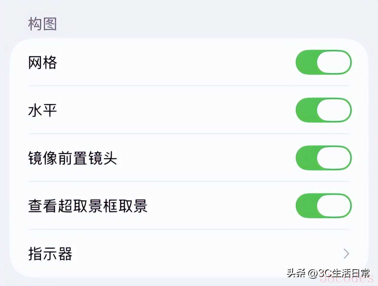 在【相机】设置中开启网格线和水平仪,帮助你构图更加精准。